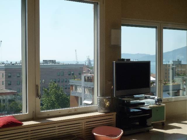 MAZZETTA - In palazzo di fattura moderna, disponiamo di appartamento di mq 205 sito al 9° piano con doppio ascensore così composto: ampio ingresso con porta blindata, cucina abitabile, ampio salone di circa 80 mq con balcone, tre camere matrimoniali di cui una con balcone, stanzino adibito a cabina armadio, doppi servizi. Tutte le pareti della casa sono in vetro, permettendo così una spettacolare vista sul golfo della Spezia. Rifiniture di lusso. Molto luminoso Oggetto unico nel suo genere. Prezzo trattabile.