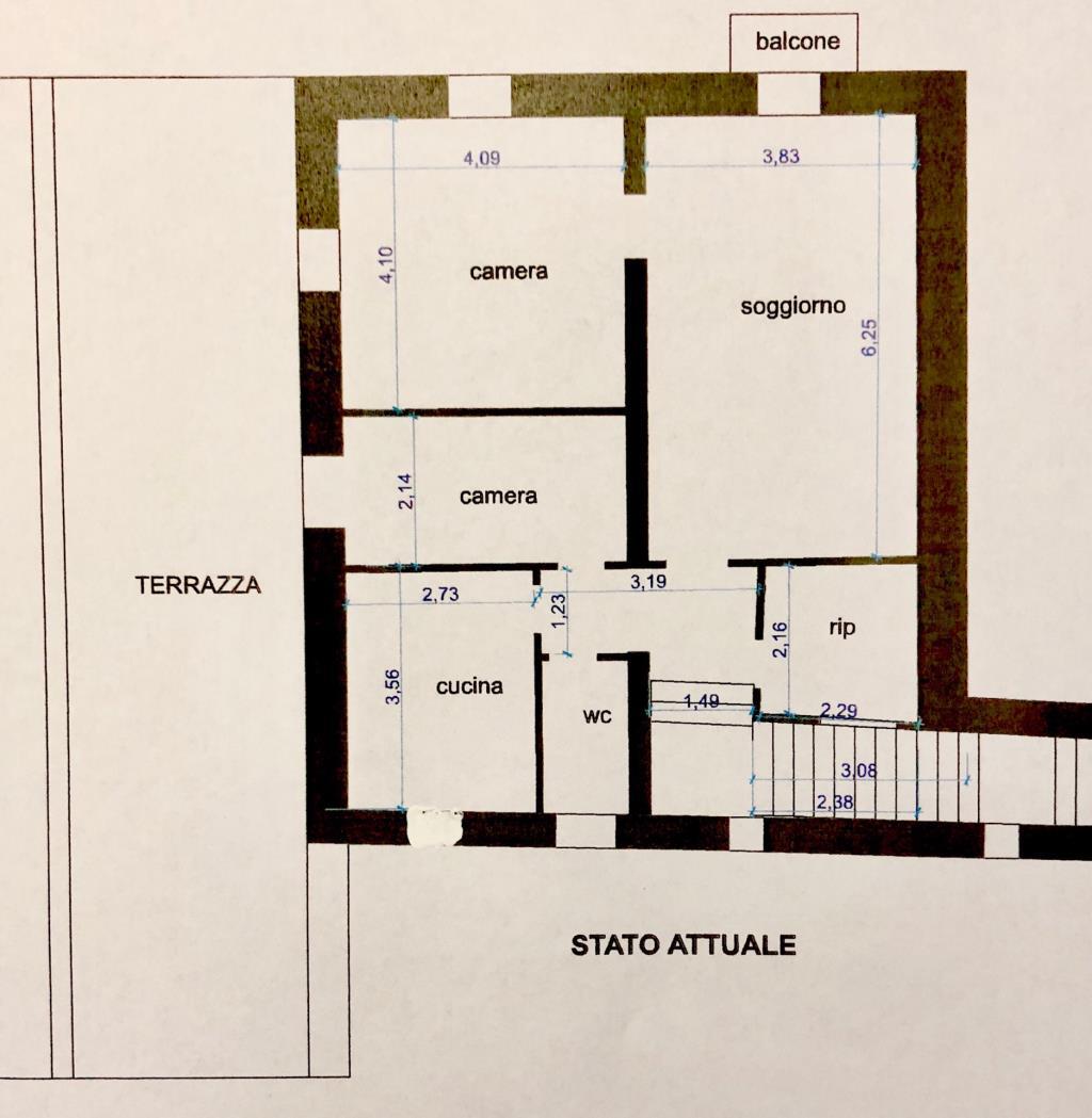 In zona Centrale, appartamento sito al piano primo di palazzo di inizio secolo, così suddiviso: ampio vano di ingresso seguito da scale interne che conducono ad un secondo disimpegno di ingresso, grande soggiorno con balcone, cucina abitabile, camera matrimoniale, cameretta, bagno e ripostiglio per totali mq. 85. Terrazza al piano di mq. 50. Interni da riqualificare con progetti per creare: soggiorno open space con cucina a vista, camera matrimoniale, due camerette e doppi servizi. Ottimo potenziale di sviluppo. Oggetto unico per il centro città.