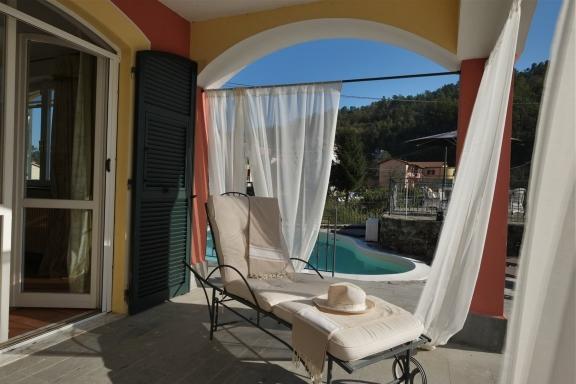 Sulla strada per le 5 Terre, in località rinomata per la cultura gastronomica, vendesi villa disposta su 4 livelli con mq. 500 di giardino privato, zona solarium e ampia piscina, così divisa: Piano Terra: accesso dalla strada al ampio garage, 2 locali tecnici, 2 ampi ripostigli e ampia cantina con cucina abitabile, camino, zona ristoro, zona divani e bagno. Primo piano: accesso privato oppure dalla scala interna composto da: enorme soggiorno con splendido camino in pietra, sala da pranzo e cucina abitabile. A questo piano, da entrambi i lati della villa, si accede a due stupendi porticati di mq. 30 ciascuno utilizzati come zona relax e sala da pranzo esterna. Da questo piano si accede al giardino circostante di e alla piscina. Secondo piano: 3 ampie camere matrimoniali, ripostiglio e 2 bagni. Tutte le camere accedono ai terrazzi di mq. 20 ciascuno con splendida vista sul panorama verde circostante. Terzo piano: ampia mansarda abitabile con due camere da letto e il bagno. Ottime rifiniture generali, recentemente ristrutturato con materiali di vero pregio: bagni in marmo e bisazza, doppi vetri, parquette e laminati di rara reperibilità. Ottimo investimento per seconda casa oppure per attività di casa vacanze o bed & breakfast.