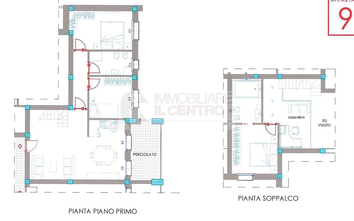 Soluzione 9: Appartamento posto al Piano Primo ed ultimo, composto da: ingresso in soggiorno con angolo cottura e terrazza abitabile con pergolato, disimpegno, camera matrimoniale, cameretta  e bagno; al Piano superiore soppalco con zona studio, camera matrimoniale ed ulteriore servizio. Completa la proprietà 1 posto auto.