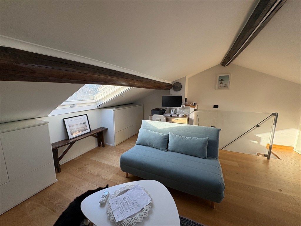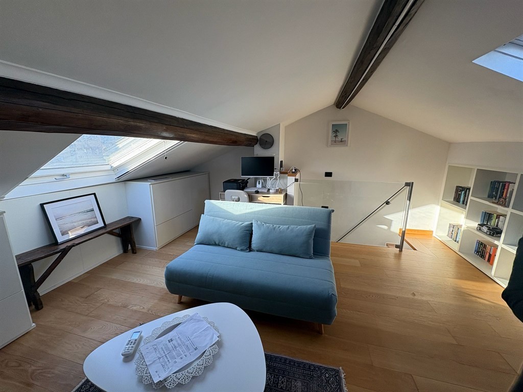 L’ingresso si apre su una spaziosa zona living composta da soggiorno con angolo cottura, ampio bagno finestrato due camere matrimoniali di cui una con accesso diretto al balcone. tramite una scala interna si accede al piano superiore dove è collocato un locale di servizio completo eleganti rifiniture