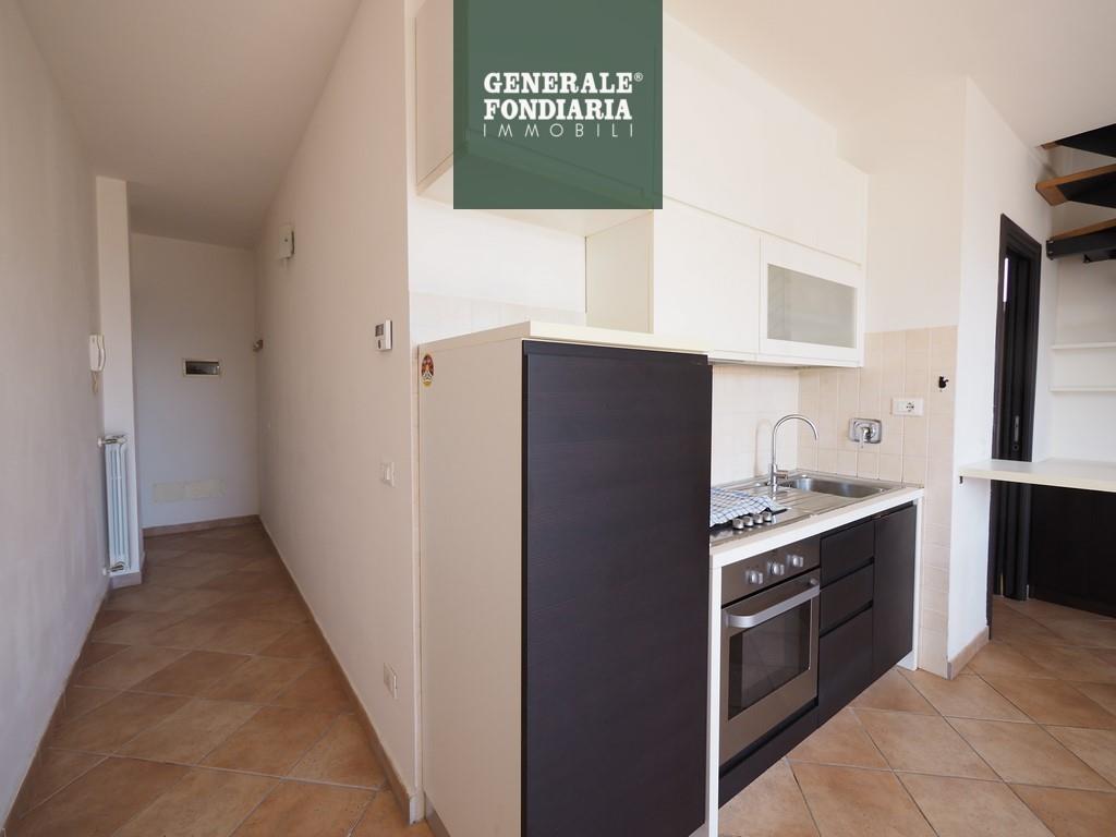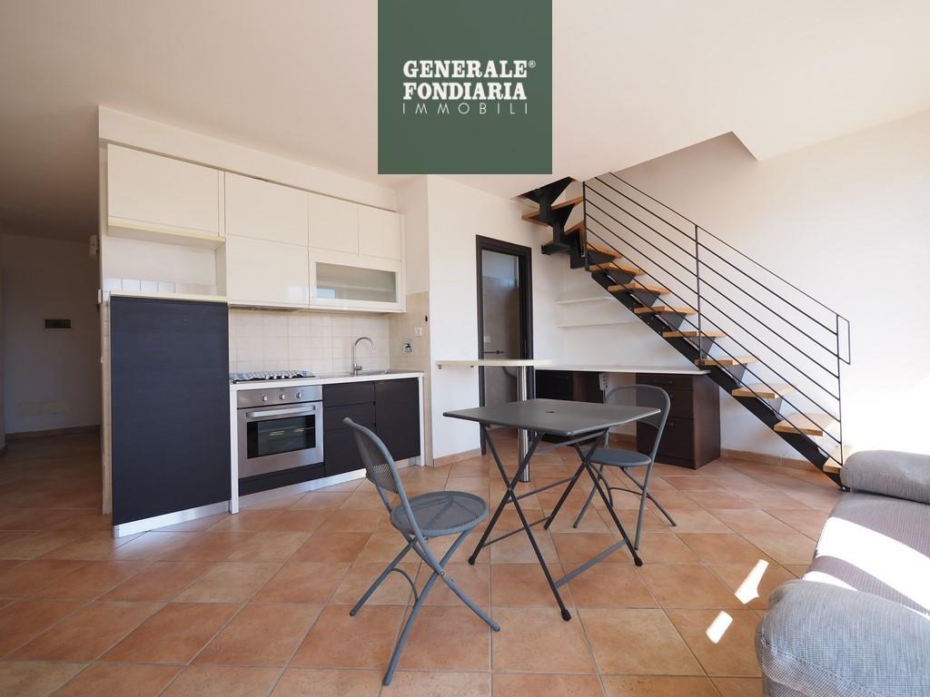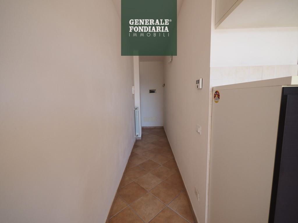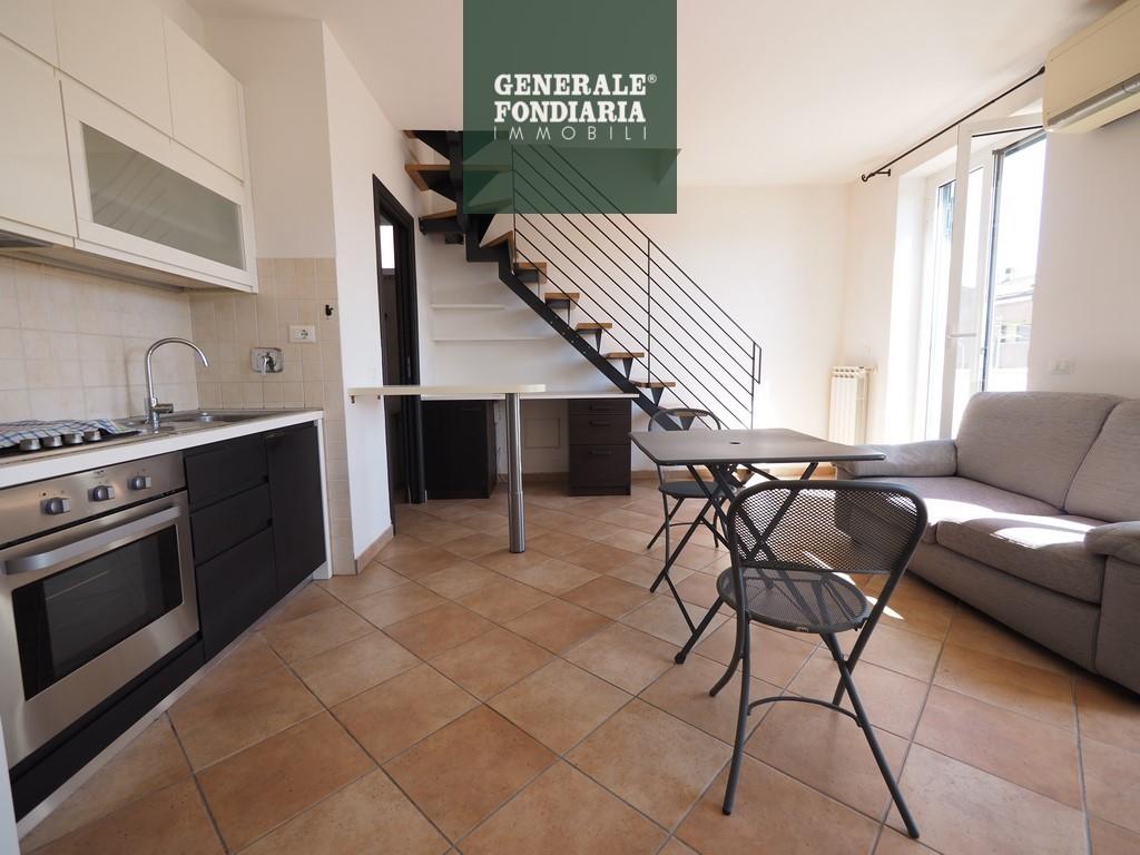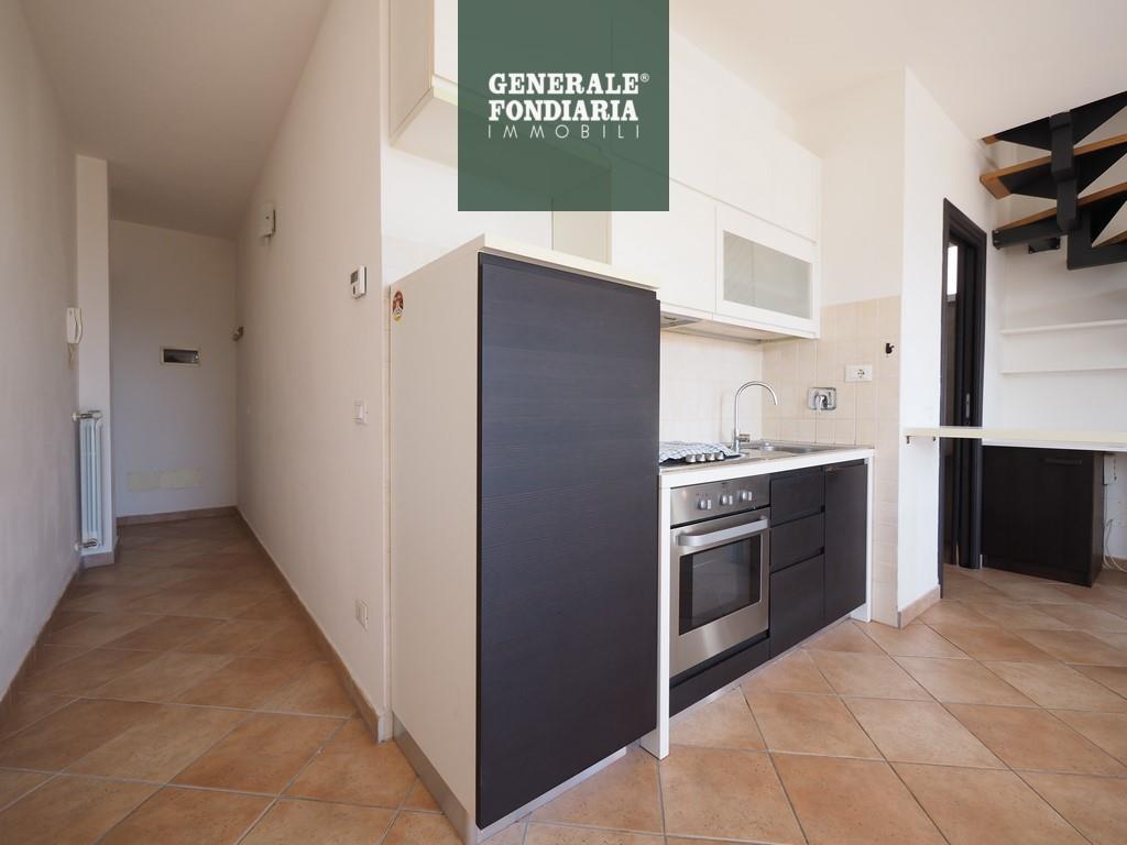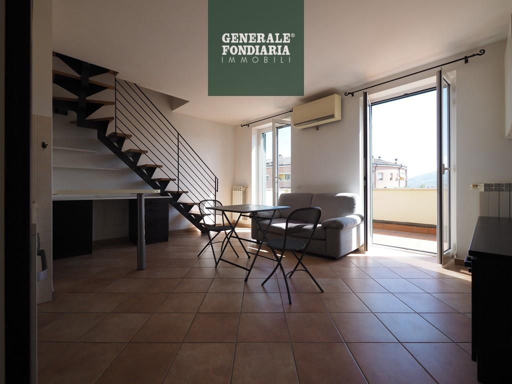 Ingresso in corridoio, zona giorno unica con cucinotto a vista e salotto con accesso alla terrazza vivibile, bagno finestrato con doccia e lavatrice, al piano superiore camera da letto con stanza armadi e secondo bagno sempre finestrato e con doccia.